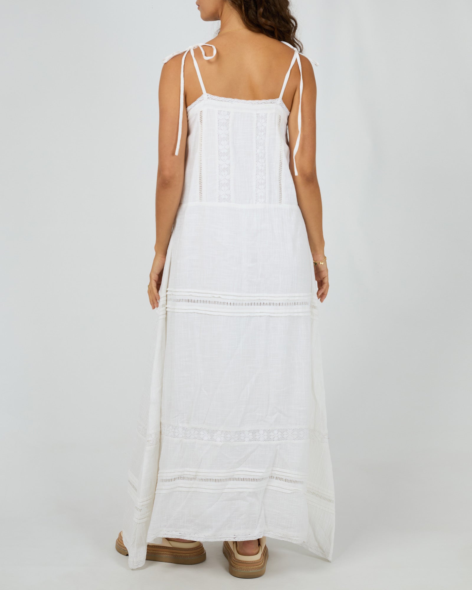 The Dusty Maxi Dress is a timeless romantic in crisp white, featuring delicate fabric ties as sleeves and lace trim along the neckline. Seven buttons run down the bodice to the waist, where a tiered, flowy skirt cascades for effortless movement. Pair it with strappy sandals or woven accessories for an ethereal spring look.