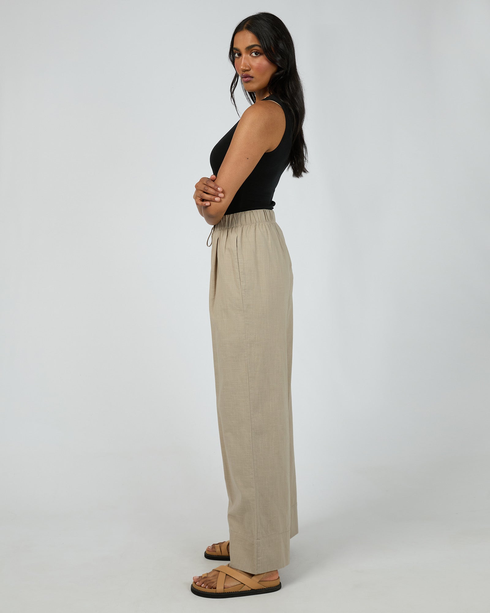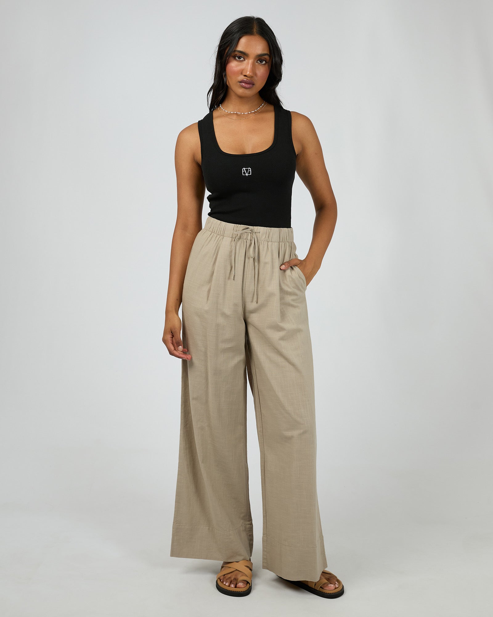 Experience comfort and style with the Essential Pant. Designed with a relaxed fit and a wide leg, these pants offer a drapey silhouette that moves with you. The elasticated waistband features an adjustable drawstring for a personalized, secure fit, making them perfect for everyday wear.