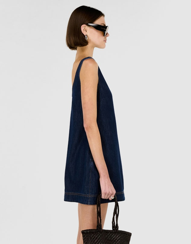 The Lea Denim Mini Dress with Scoop Back is a modern essential with a clean, minimal silhouette designed for effortless everyday wear. Crafted from a soft cotton and lyocell blend denim, it features a sleeveless cut and a flattering A-line shape that works seamlessly from day to night.
