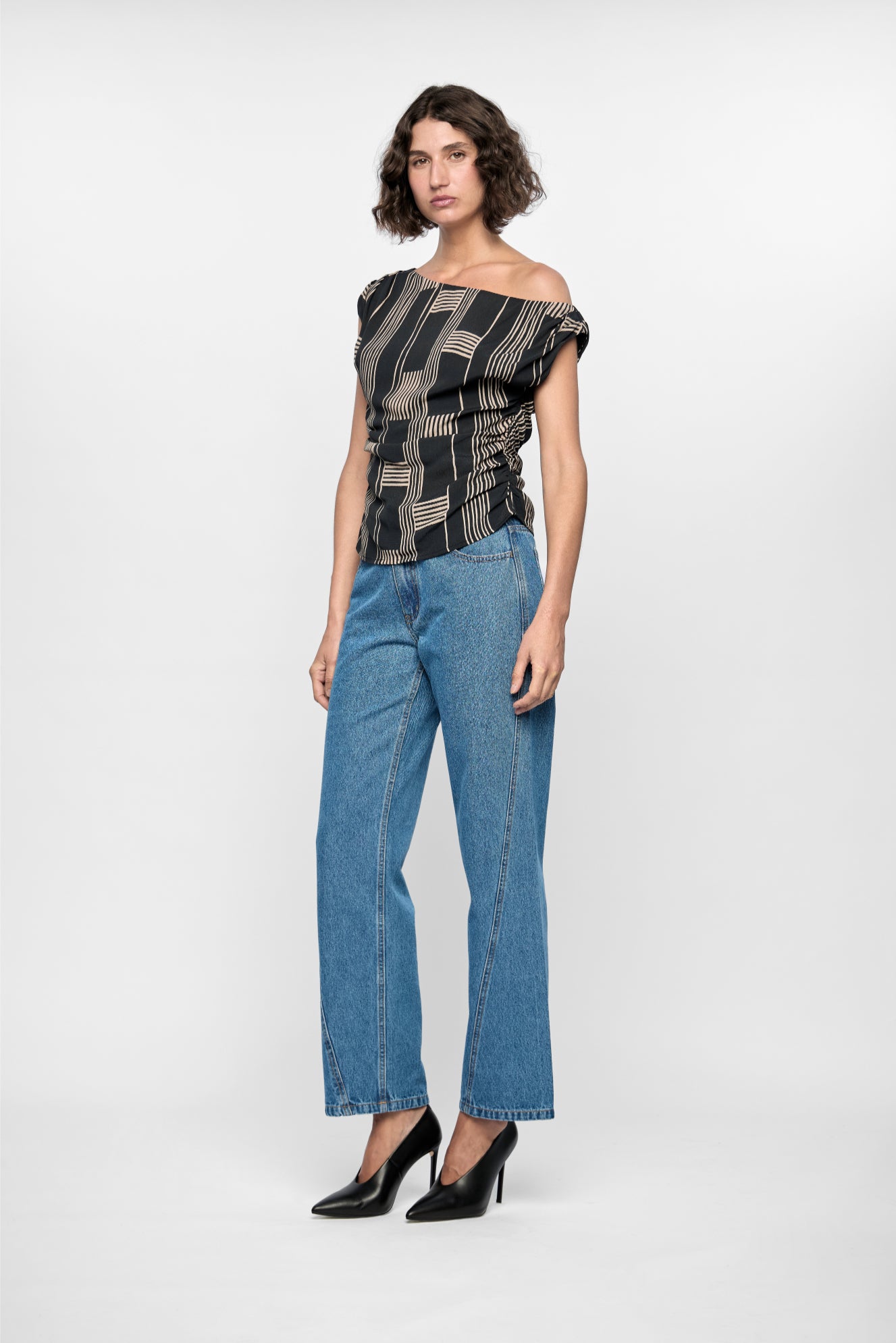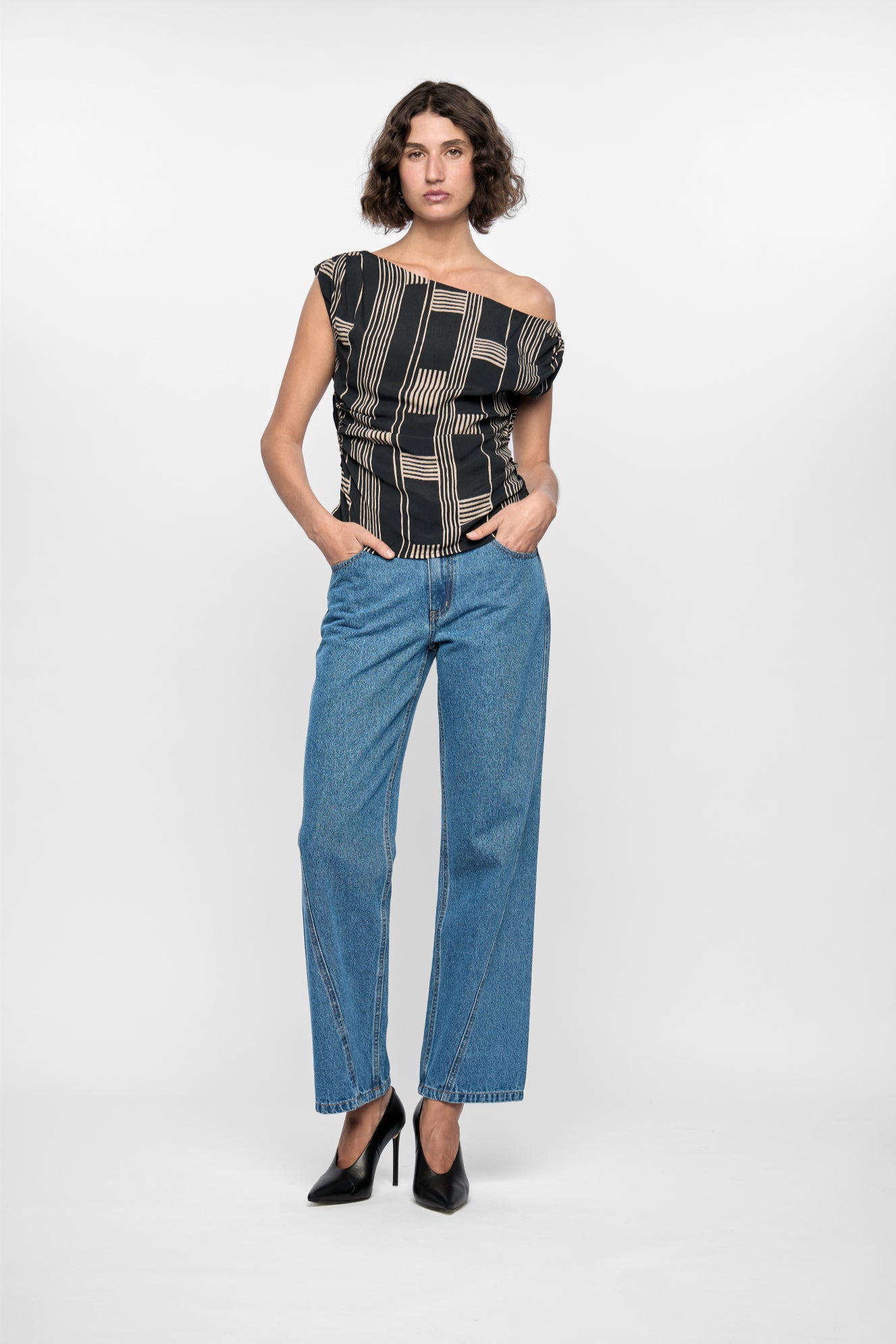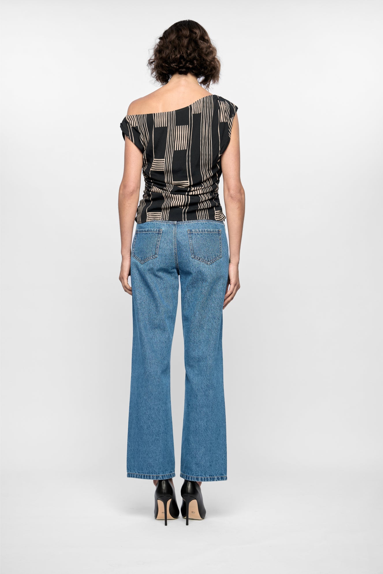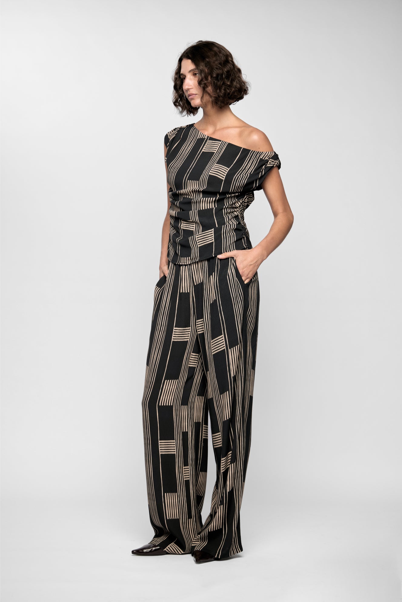Effortlessly modern, the Marina Asymmetrical Top is cut in a soft viscose with a bold abstract stripe print. Wear it off-shoulder for an elevated feel. Pair with the matching Marina Pants or dress it down with denim.